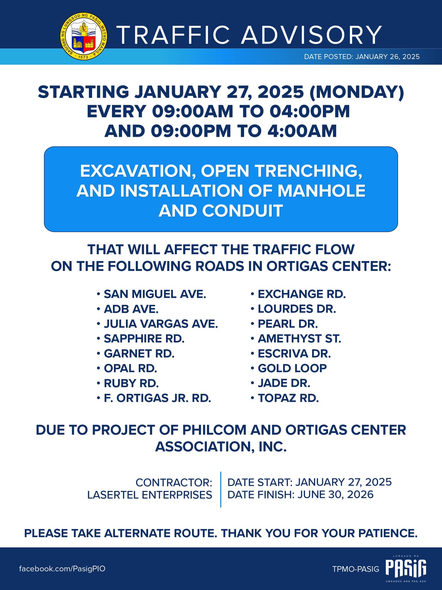 The Pasig City Public Information Office (PIO) announced that excavation, open trenching, and installation of manholes and conduits will begin on Jan. 27 every 9 a.m. to 4 p.m. and 9 p.m. to 4 a.m. It warned motorists that this may cause traffic on certain roads.