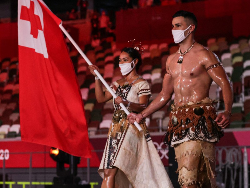 Photo: Tonga's flag bearers Pita Taufatofua (L) and Malia Paseka (2L) lead their delegation as they parade during the opening ceremony of the Tokyo 2020 Olympic Games, at the Olympic Stadium, in Tokyo, on July 23, 2021. Odd ANDERSEN / AFP