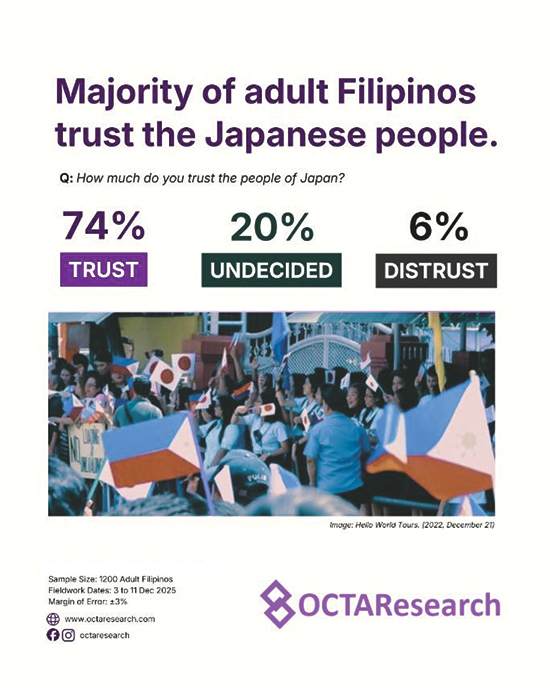 A nationwide survey conducted in December 2025 shows that 8 in 10 Filipinos, or 79%, express trust in Japan. Meanwhile, 17% are undecided, and only 4% express distrust.