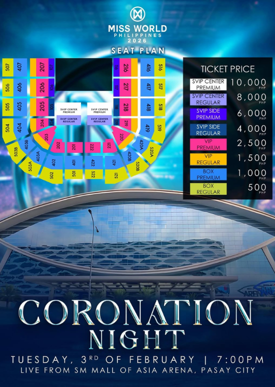 Everything is all set for the Miss World Philippines 2026 coronation night, happening on Feb. 3, 7 p.m. at the SM Mall of Asia Arena.