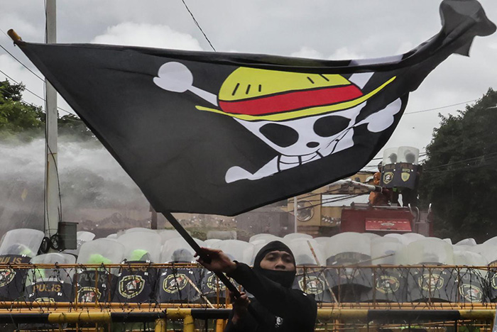 One person was seen waving a flag showing a skull wearing a straw hat from the hit anime series One Piece. The flag was previously seen in anti-corruption demonstrations in other countries such as Nepal and Indonesia. For One Piece fans, the flag symbolizes Luffy's quest to liberate oppressed people and fight against the authoritarian government.