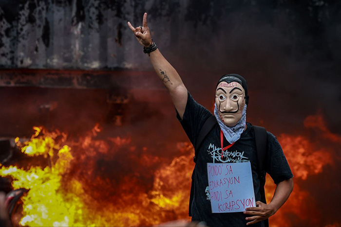 Meanwhile, near the Malacañang compound, a group of protestors threw rocks and bottles at police in two separate incidents, setting fire to the tires of a trailer used as a barricade near the Ayala Bridge.