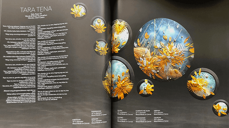 As Francisco notes in his opening essay, “For years, they’ve been wanting to create a project that would visualize music.” Their collaborations led to a series of exhibitions throughout the country, and in various cities worldwide: 36 artworks by Lim interpreting Manolo’s song Kuwento ng Alon in visual form. (Lim also contributed the stylized black and white portraits of the singers who interpreted Manolo’s song, including Rico Blanco, Gary Valenciano, Catriona Gray, Piolo Pascual, Toni Gonzaga, Regine Velasquez and Itchyworms.)