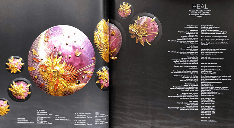 Leafing through the handsome volume, there’s a lot to admire. Lim’s artworks employ her signature style, mixing pastel tones and gold leaf, objects from nature with metallics and mesh, seeds, balanced with textural details—her images “fairly aching and quaking with the gravitas of feelings infused with grace and prayers,” says essayist Cid Reyes.