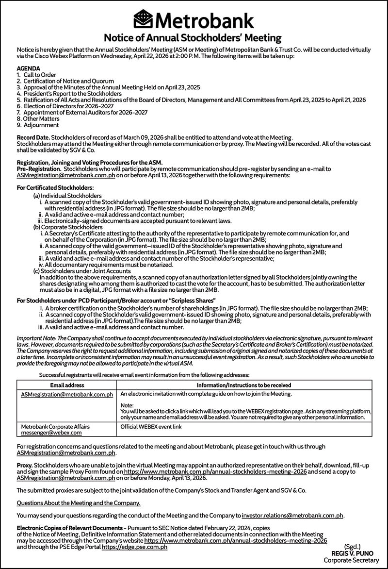 News and Views · Latest | Announcements Metrobank issues Notice of Annual Stockholders’ Meeting Published Mar 28, 2026 4:55 am BrandedUp in partnership with *** Editor's note: This notice was provided by Metrobank. Share this article TAGS: BrandedUp Metrobank