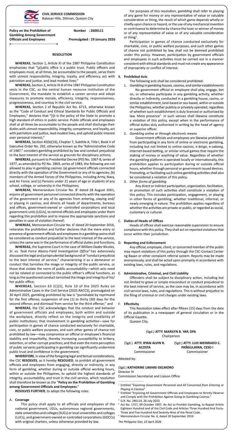 The prohibited acts identified by the CSC include entering or staying in casinos or gambling houses (including licensed establishments), whether land-based or sea-based, locally or abroad; online gambling via online casinos, e-bingo, e-sabong, and any internet-based betting; and organizing and participating in any other gambling activity, "whether traditional, informal, private, social, cultural, or newly emerging."