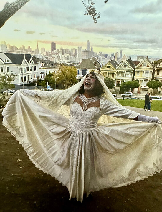 Divided into eight chapters and edited by the celebrated Fil-Am writer Marivi Soliven, the book takes Gil around the world (none of this is AI— the photography took many years and plane flights to complete), posing in various locales and contexts, often in costume, to mimic or to pay homage to familiar figures and situations. The pop-culture setups will likely elicit the most laughs and smiles—Tina Turner, Maria von Trapp, and of course Barbie all get their comeuppance—and the UP Oblation poses (thankfully just backsides) show the malayong lupain that our iskolars ng bayan has reached (Gil studied and taught Humanities in UP before going to Stanford for his master’s). The levity aside, he strikes thoughtful, almost architectural, poses against spare backdrops. He draws his husband Roy, a normally reticent software engineer, into take-offs on couples (Ari and Jackie, Ennis and Jack). The effect is both riotous and reflective, a visual essay on how pop and political culture have overwhelmed us, but also how we have appropriated and domesticated them for our own purposes, if only to say, “Hey, I can be as good as that!”