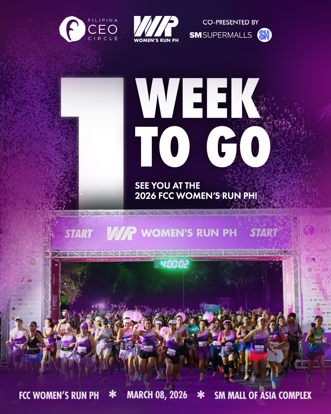 Women and girls in their running era will gather at SM MOA Complex for the 2026 FCC Women's Run on March 8. The fun run is divided into three categories: 1K, 5K, 10K, and 16K.