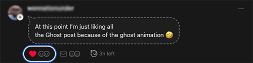 Ghost posts show up on your feed in a dotted chat balloon. When you like the post, a ghost emoji animation will show up before it becomes a heart. Also at the bottom is a ghost post icon that shows you how many hours are left before the thread is archived.