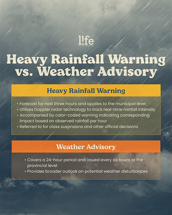 According to PAGASA, the key difference between a weather advisory and a heavy rainfall warning lies in their "forecast period, coverage areas, and accuracy."