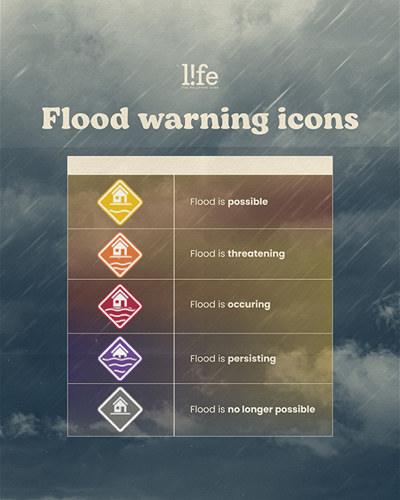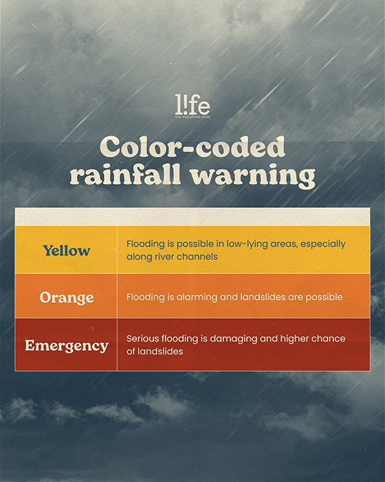 Yellow means that flooding is possible in low-lying areas, especially along river channels. Orange signals that flooding is alarming and landslides are possible, while red is the most dangerous as it means that the flooding is serious and damaging and has a higher chance of landslides.