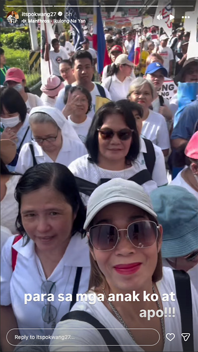Actress Pokwang took to Instagram stories to share a video clip of her with protesters in white at the Trillion Peso March.