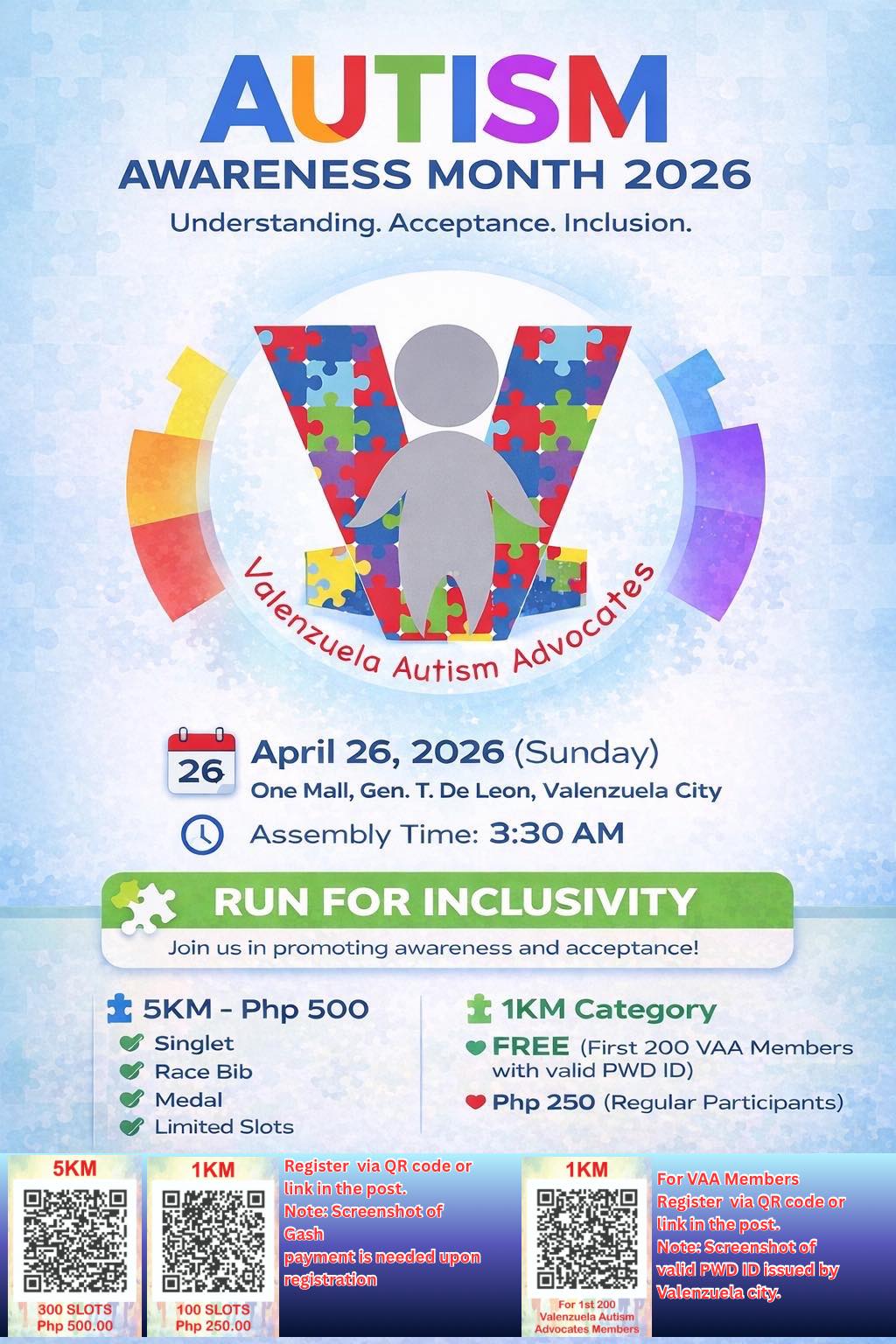 Assembly starts as early as 3:30 a.m., with race categories including a 5KM run (P500) and a 1KM run, which is free for the first 200 VAA members with valid PWD IDs. Regular participants can join the 1KM category for P250.