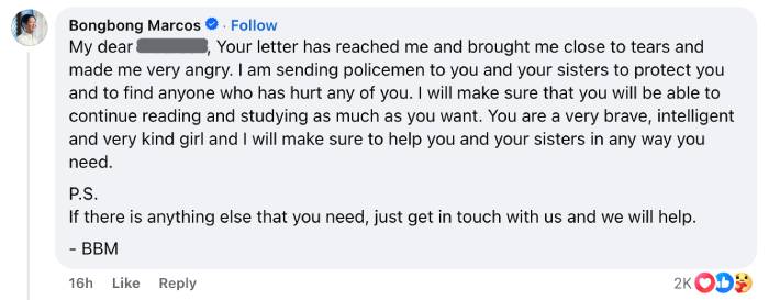 President Ferdinand Marcos Jr. has responded to an 11-year-old girl who asked for his help amidst her and her family's experiences of alleged abuse and harassment by a local barangay official, his sons, and a staff member.