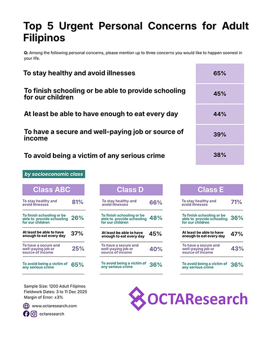 From a list of five concerns, 65% said it is to stay healthy and avoid illness. Meanwhile, 45% said it's to finish schooling or be able to provide schooling for our children, 44% noted it's to be able to have enough to eat every day, and 39% shared it's to have a secure and well-paying job or source of income. Lastly, 38% said their urgent personal concern is to avoid being a victim of any serious crime.