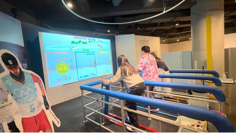 There is also a virtual cross-country skiing race, known as the marathon on snow, where you compete side-by-side with two other people. The big screen shows who’s leading in real time. In the end, your medal standing shows onscreen, complete with gold, silver, and bronze virtual medals.