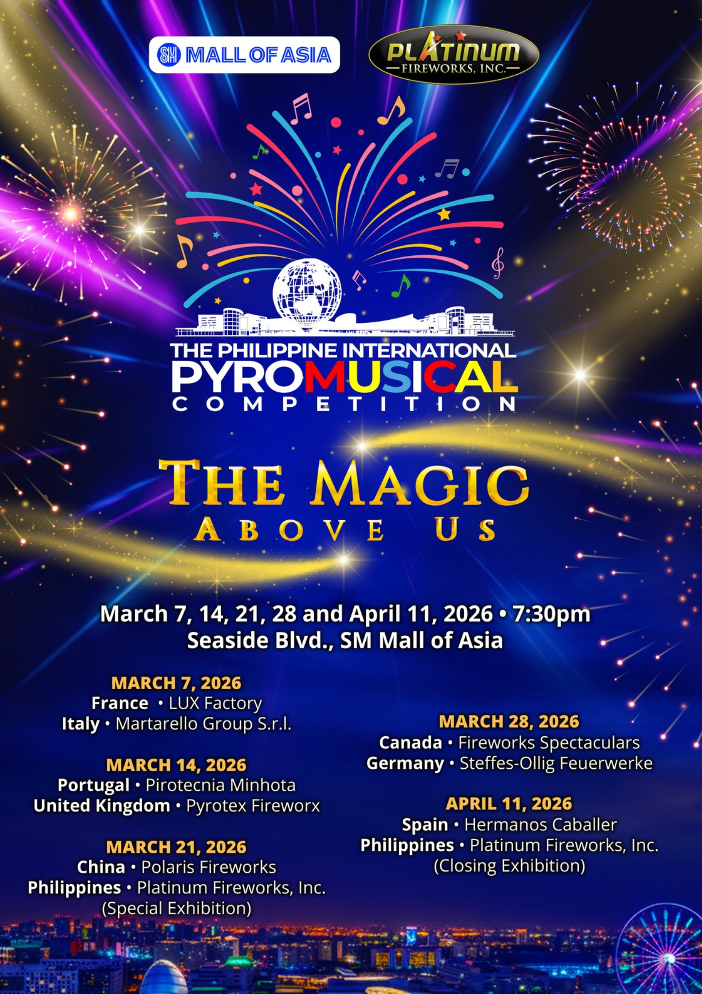 France’s Lux Factory and Italy’s Martarello Group S.R.L. will perform on March 7 at 7:30 p.m. along Seaside Boulevard, SM Mall of Asia. Their show will be followed by a series of performances from other international participants through April 11.