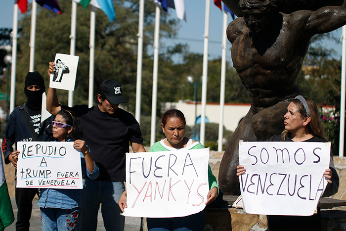 "Venezuelan brothers, resist... don't hand over your land, your oil, your gold" to the United States, protest leader Mario Benitez told the crowd in Mexico, waving banners with slogans such as "No to war."