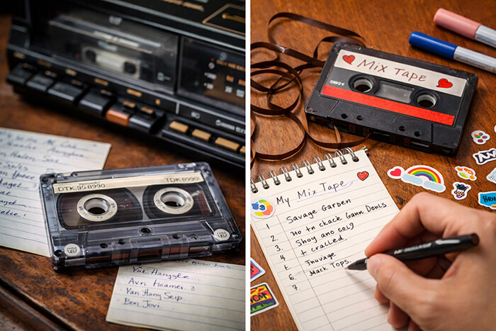 This was how we made mix tapes, too—we recorded songs from the radio or from other cassette tapes, curating a collection of our favorites. And if you had a crush? A mix tape was a labor of love, and the perfect way to bare your soul, letting the music say what you couldn’t. Bonus points if you designed an album cover and handwrote the track list.