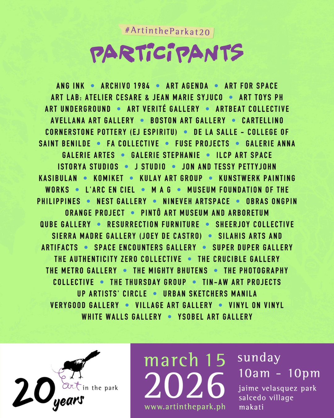 In celebration of its 20th year, the fair will also showcase works by artists who have previously headlined the event, including Bjorn Calleja, Carlo Tanseco, Demi Padua, Jomike Tejido, Marina Cruz, Anna Bautista, AR Manalo, Charlie Co, Manny Garibay, Pepe Delfin, TRNZ, Clarence Chun, Lynyrd Paras, and Robert Alejandro.