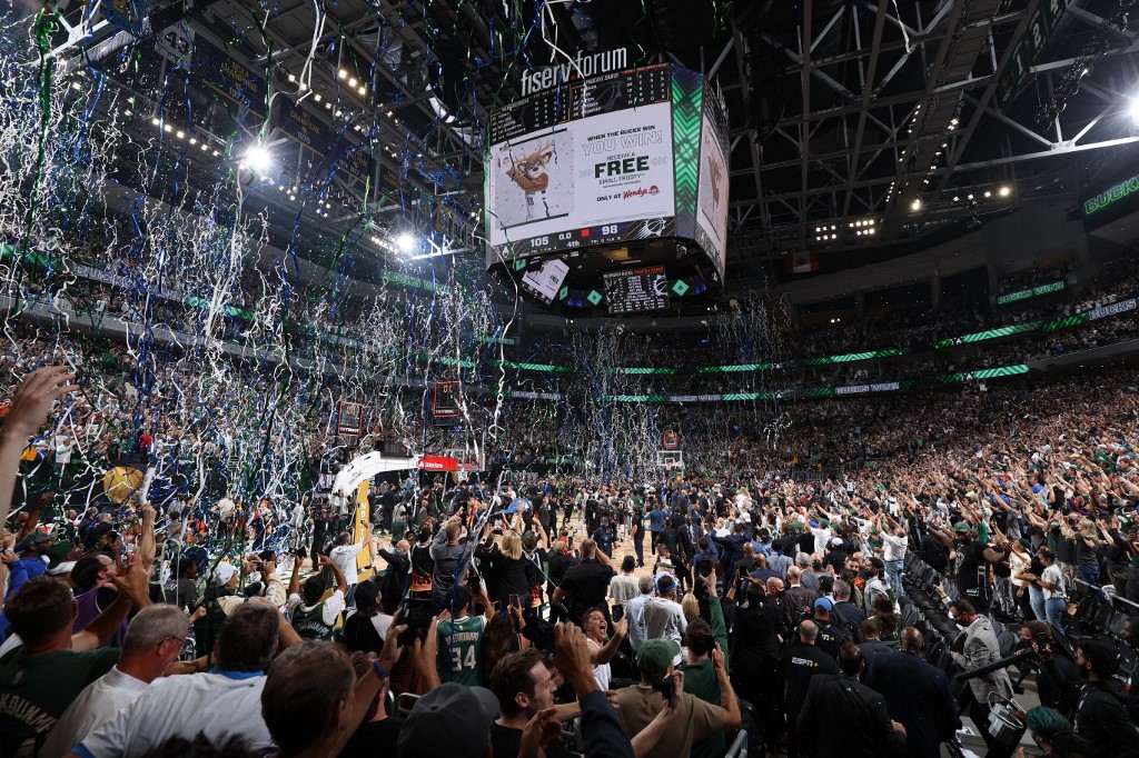 An overall view of the arena after the Milwaukee Bucks win the 2021 NBA Finals on July 20, 2021 at the Fiserv Forum in Milwaukee, Wisconsin. (David Sherman / NBAE / Getty Images / Getty Images via AFP)