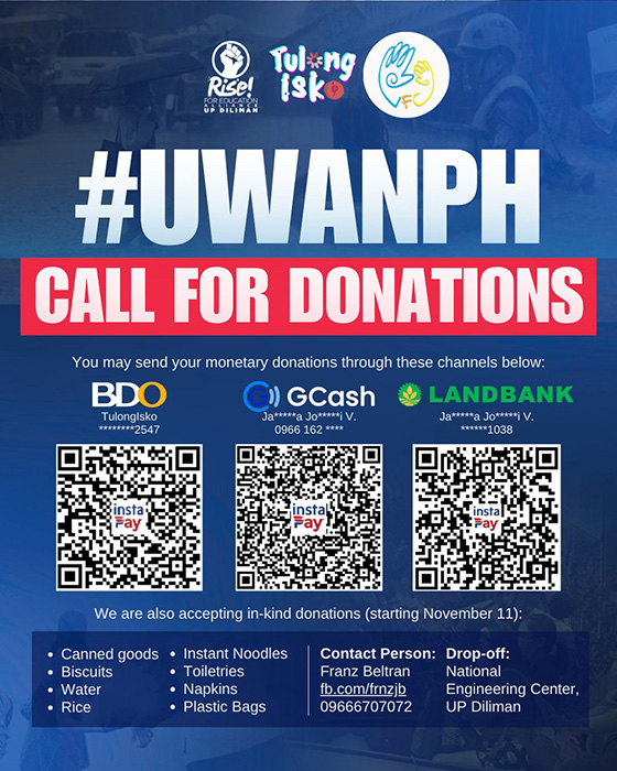 You can drop off your in-kind donation at the National Engineering Center in UP Diliman starting Nov. 11.