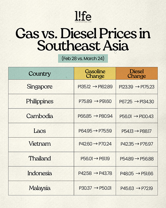 Indonesia saw modest increases, with gasoline rising from Rp 12,050 (P42.58) in February to Rp 12,390 (P43.78) in March, and diesel rising from Rp 13,600 (P48.05) to Rp 14,620 (P51.66).