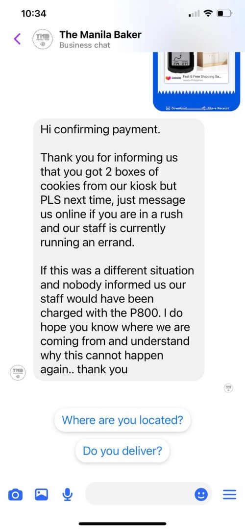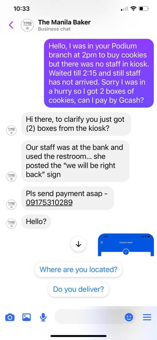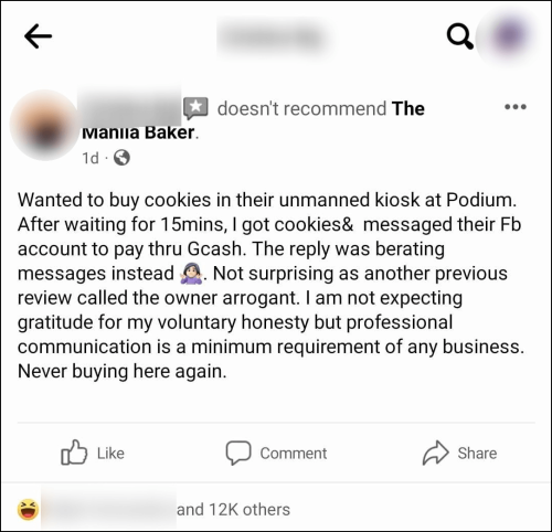 "After waiting for 15 minutes, I got cookies and messaged their Facebook account to pay through GCash," the user said about The Manila Baker in a now-deleted review. "The reply was berating messages instead."