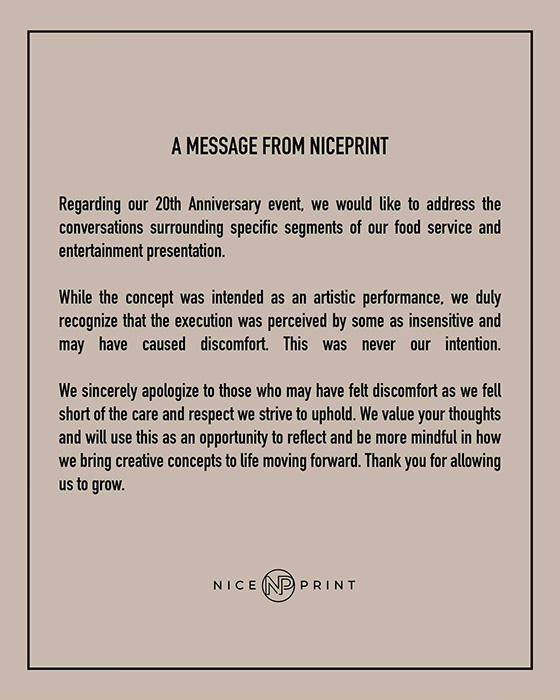 Nice Print has since released its statement regarding the food presentation.