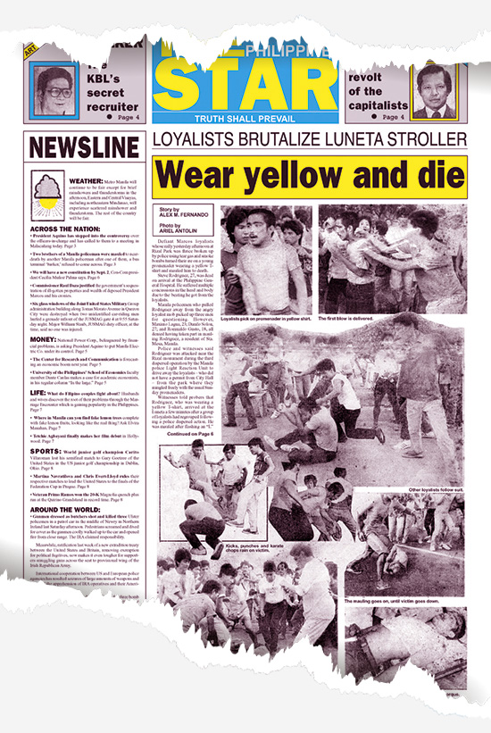 The story featured the death of a bystander, 23-year-old Stephen Salcedo, killed by a mob of Marcos loyalists during a rally at Manila's Luneta Park.