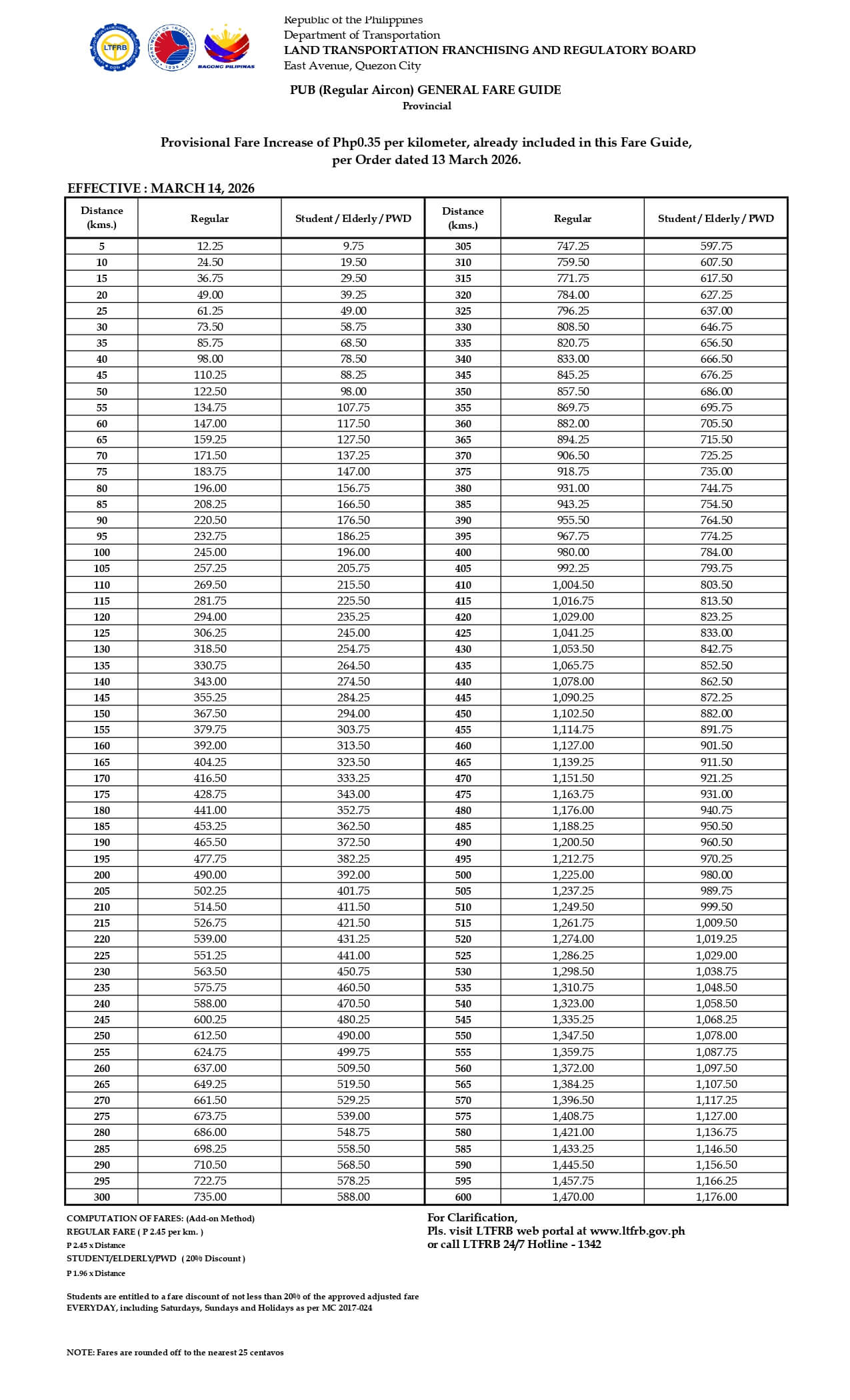 - PUB Provincial (Airconditioned) – Provisional fare increase of P0.35 per kilometer
