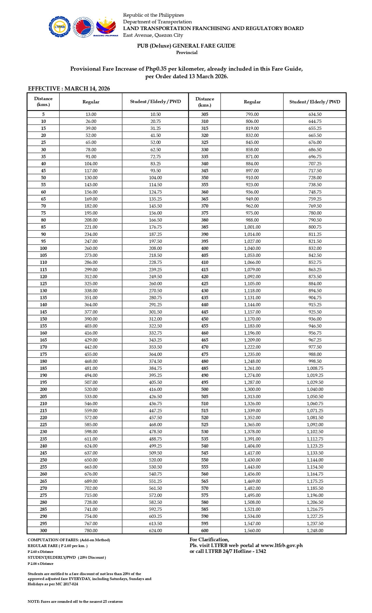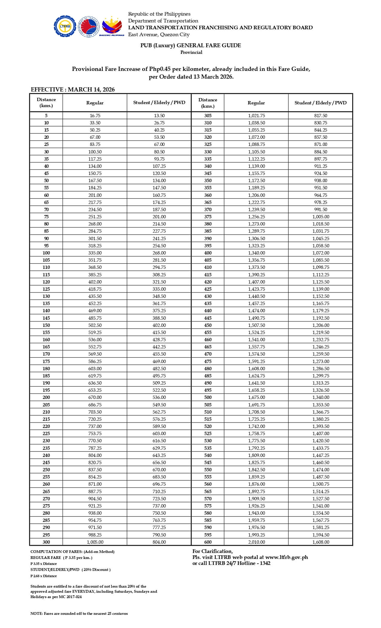 - PUB Provincial (Deluxe) – Provisional fare increase of P0.35 per kilometer