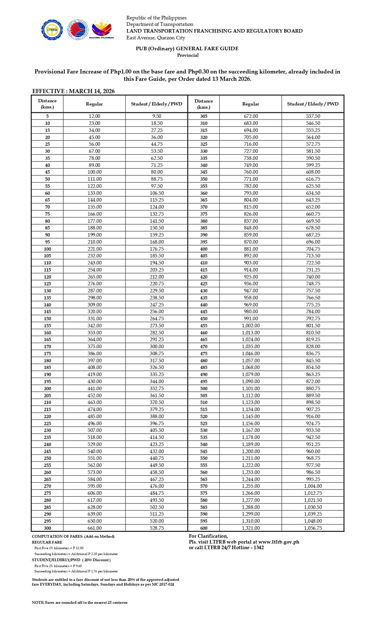 - PUB Provincial (Ordinary) – Provisional fare increase of P1.00 on the base fare and P0.30 on the succeeding kilometer