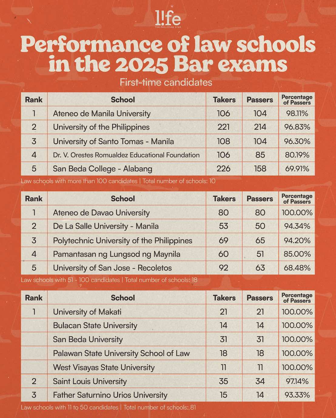 A total of 137 out of 143 schools emerged with successful Bar exam takers. Among the law schools with over 100 first-time candidates, Ateneo de Manila University had the highest percentage of passers at 98.11% (104 out of 106), followed by the University of the Philippines at 96.83% (214 out of 221) and University of Santo Tomas-Manila at 96.30% (104 out of 108).
