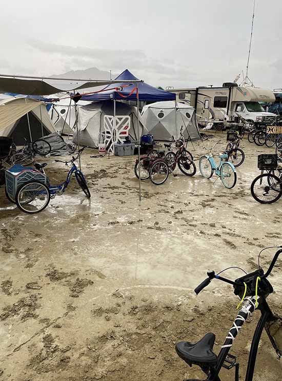 Video footage showed costume-wearing "burners" struggling across the wet gray-brown site, some using trash bags as makeshift boots, while many vehicles became stuck in the sludge.