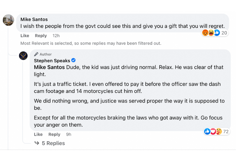 “We did nothing wrong, and justice was served proper the way it is supposed to be. Except for all the motorcycles breaking the laws who got away with it,” he stressed. “Go focus your anger on them.”