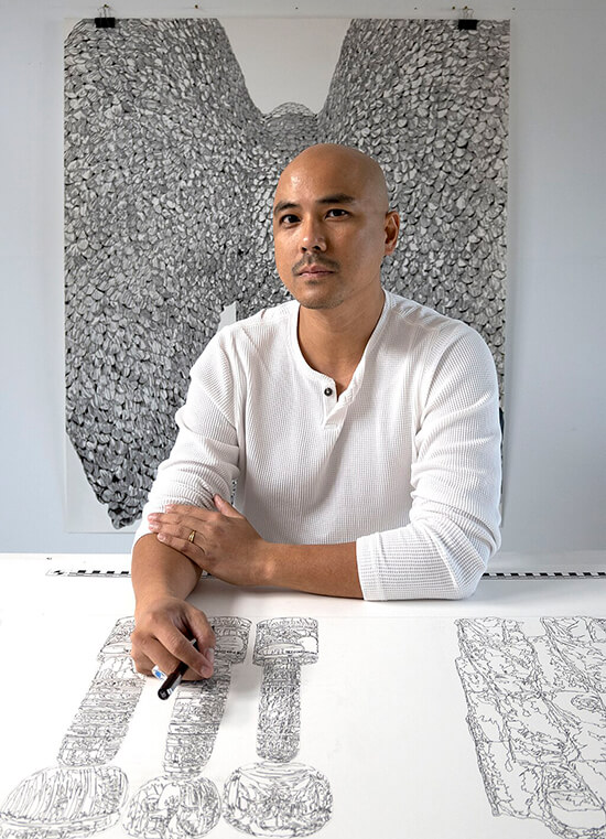 Abad tackles cultural loss and colonial histories, often ruminating on his upbringing in the Philippines where he was born in 1983 to parents Butch and Dina Abad, whose roles as activists in the fight for social justice inform his works. His aunt, the late artist Pacita Abad, whose estate he curates, encouraged him to study art abroad, landing him in Glasgow in 2004 and the Royal Academy in 2009. Solo shows followed in London and Manila where he had exhibits at Silverlens in 2013 and 2017 and one at Ateneo Art Gallery in 2022, aside from shows in San Francisco and Ontario in 2019.