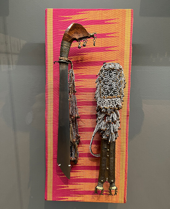 Pieces of 19th-century bladed weaponry from Mindanao are displayed against vivid fabrics by Sinagtala, a community of displaced female weavers, built on the ashes of the siege of Marawi in 2017 when the government bombed the city in a quest to capture a militant Islamic group. The jagged motifs represent the tremors that reverberated as they were weaving while bombs fell. The swords were taken during the Philippine-American war when US colonizers battled against the Moros, the Muslim population which has waged a secessionist struggle since the 16th century against a government that has inherited the denigrated depiction of Moros from their Spanish and American colonizers. These artefacts are part of a huge number of Philippine heritage pieces that have been exiled in Western museums.
