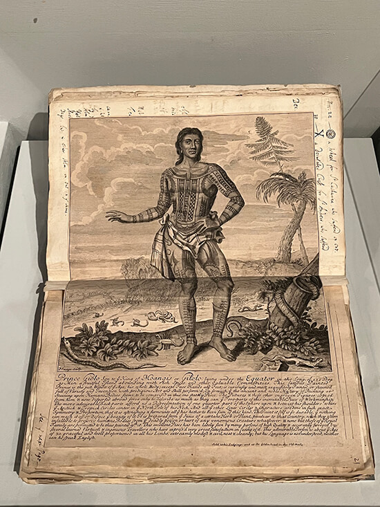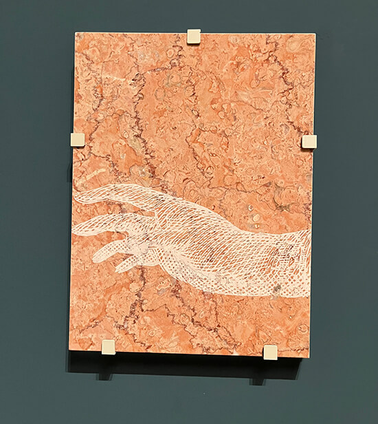 “Giolo’s Lament” responds to a 1692 etching advertising Giolo, a tattooed prince from Mindanao who was displayed as a curiosity in London pubs after he was captured by the English pirate William Dampier in 1687 who first landed in Abad’s home province of Batanes. Giolo was further dehumanized when, after dying of smallpox, a fragment of his skin was displayed at the Anatomy College in the Bodleian Library. He was later interred in an unmarked grave. It’s one of the earliest depictions of a trafficked Filipino body—a narrative of exploitation that continues to this day. Imagining the prince as a grieving son after his mother died under captivity, Abad immortalizes him through engraved renderings of his hand on 11 tablets of marble “arranged on the wall like a musical score, a spectral limb grasping for something out of reach, perhaps a body lost at sea.” It’s a moving reminder of his vulnerability and fragile humanity.