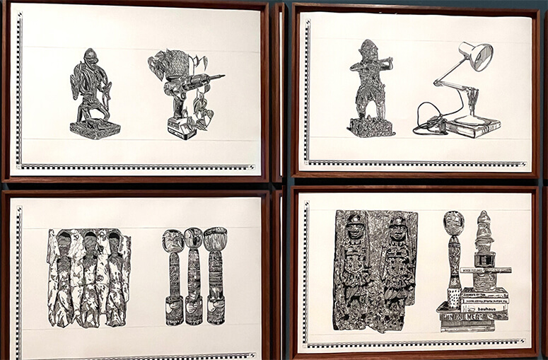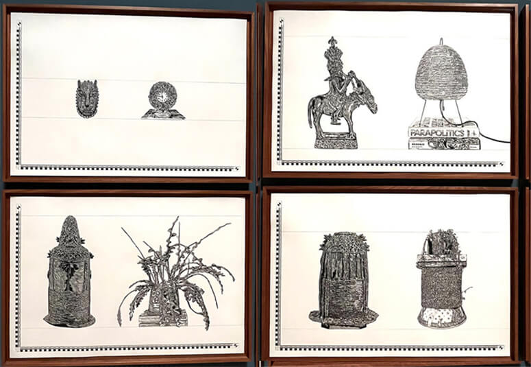 The sheer volume of objects that he had access to was quite overwhelming as he spent a year perusing inventory, visiting archives and items in storage, talking to librarians, curators and conservators. He met the challenge by choosing the pieces that had unexamined histories— those sitting in the darkness, in other words. He realized that so much history has been marginalized, unexplained, ignored or forgotten and he had to bring them to light: “You get thousands of histories, but you navigate it—and I think that’s the reason I’m an artist because it’s the spaces in between these objects where making artwork, writing or drawing comes in; it’s the spaces between these things where art becomes possible.”