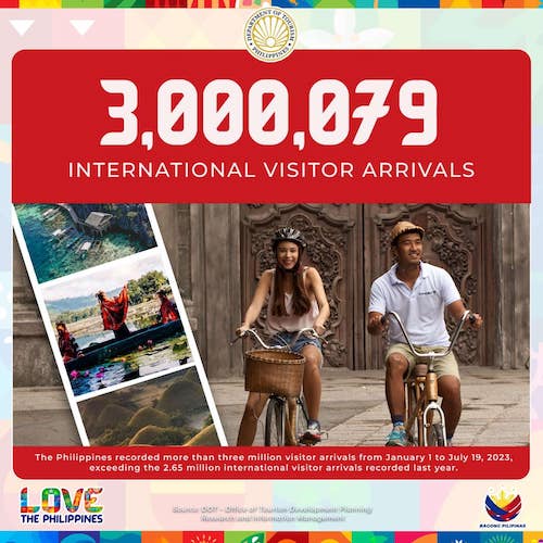 According to latest data from the Department of Tourism (DOT), the Philippines recorded a total of 3,000,079 international visitor arrivals from January 1 to July 19, 2023, exceeding the 2.65 million international visitor arrivals recorded last year.