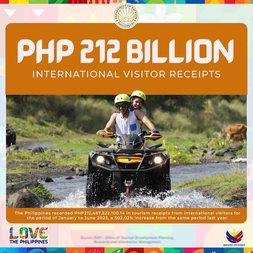 The Philippines recorded P212,467,522,100.14 in tourism receipts from international visitors from the period of January 1 to June 30, 2023 compared to the P35,292,495,457.14 tourism revenue generated in 2022.