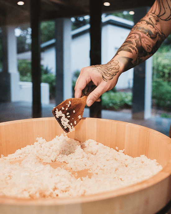 Placing the cooked rice with coconut oil in the refrigerator for 12 hours allows the rice to gel and the starchy part of the rice, or the amylose, to leave the grains.