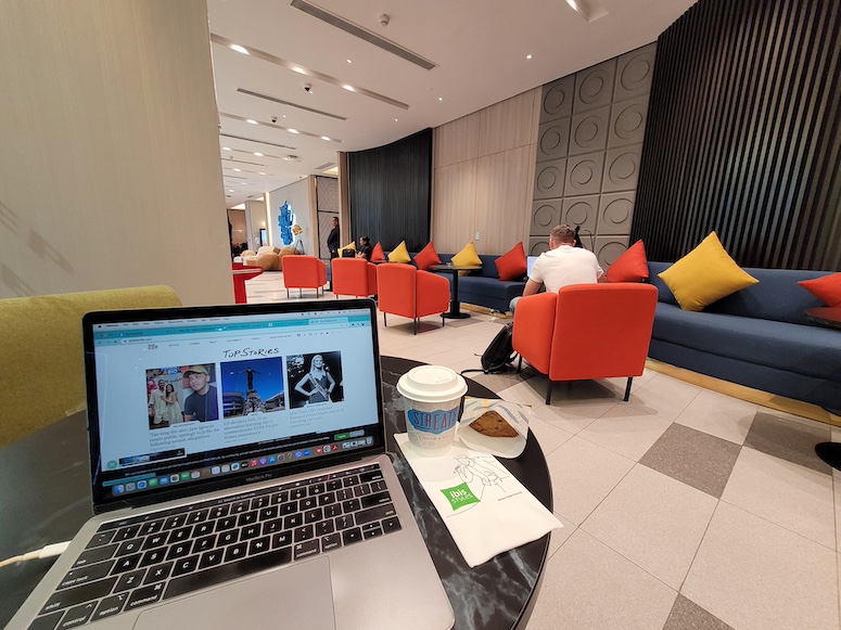 Since there was hotel security and cafe staff, I felt secure enough to leave my laptop on the table to go to the restroom while working there. There was a pleasant buzz of people around on a weekday, but it does tend to get busier towards check-in and check-out time (before and after lunch) and on weekends, so plan your visit accordingly.