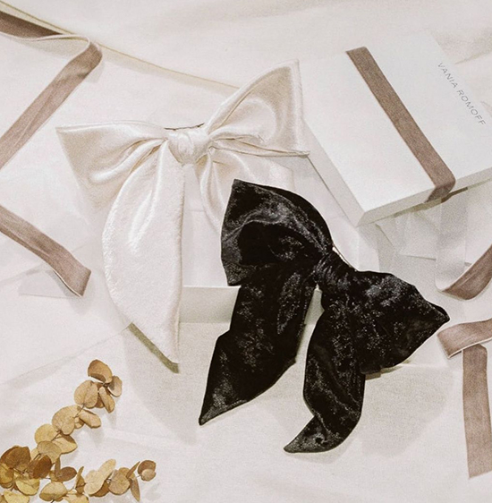 Vania Romoff bow hair clips, to be exact. These are pre-tied with a barette closure and come in sets of two — one set in ivory silk and black velvet to tie up a ladylike holiday look, while the other is made of chiffon embellished in gold dots. It’s pretty and unapologetically festive.