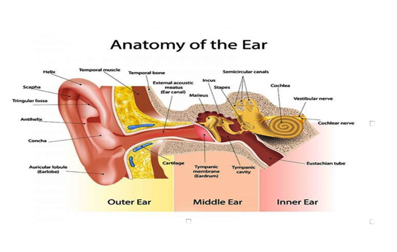 Sounds travel through the outer ear canal, setting the tympanic membrane into vibrations that are carried by three small ossicles (the malleus, incus, and stapes) in the middle to the inner ear or cochlea, where the motion of fluid allows the hair cells to release the chemicals needed to generate electrical impulses in the cochlear nerve to travel to the brain.