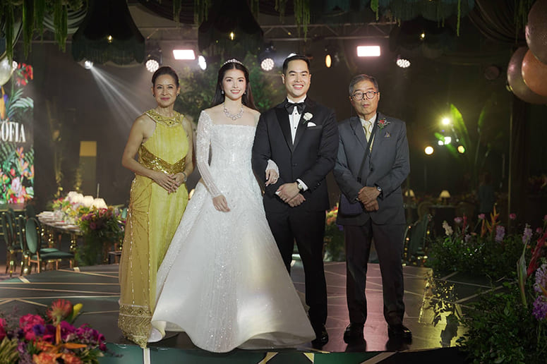 If the ceremony was heartfelt, the celebration was pure energy. The Grand Ballroom at Shangri-La The Fort was transformed into a lush Amazon rainforest dreamscape—vibrant greens, emerald velvet draping, bold blooms, and performers setting the tone from the moment guests arrived. The night carried a joyful rhythm—a steady pulse of drums, shimmying, dancing, and constant celebration—yet the most unforgettable moments were the speeches. Sofia is profoundly loved, and it showed: her younger sister’s speech and her father’s words left everyone in tears.