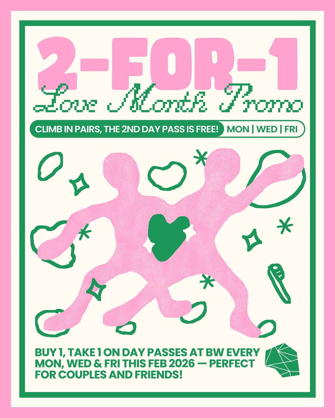 Boulder World PH is running a Buy 1, Take 1 deal on Facility Day Passes every Monday, Wednesday, and Friday throughout February for only P650.