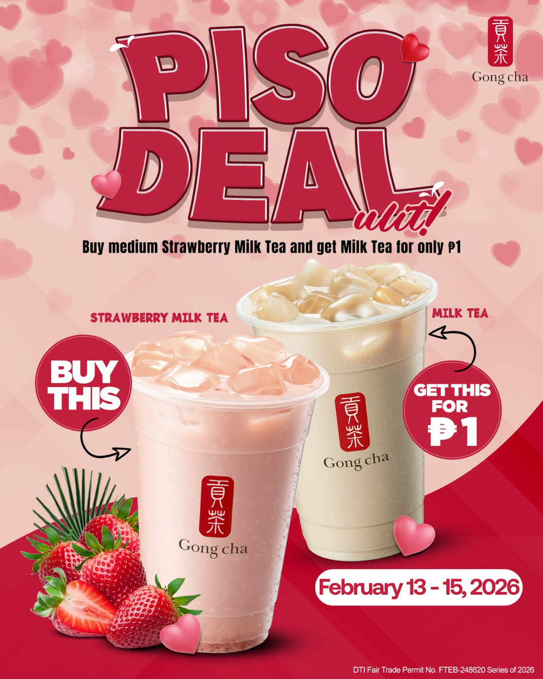 This promo is available from Feb. 13 to 15 in all Gong cha branches except Araneta Coliseum, Robinsons Dumaguete, Filinvest Marina Town, and SM City Legazpi.