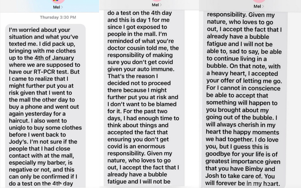 "On that note, with a heavy heart I accepted your offer of letting me go. For I cannot in conscience be able to accept that something will happen to you that brought about my going out of the bubble. I will always cherish in my heart the happy moments we had together," Sarmiento said.